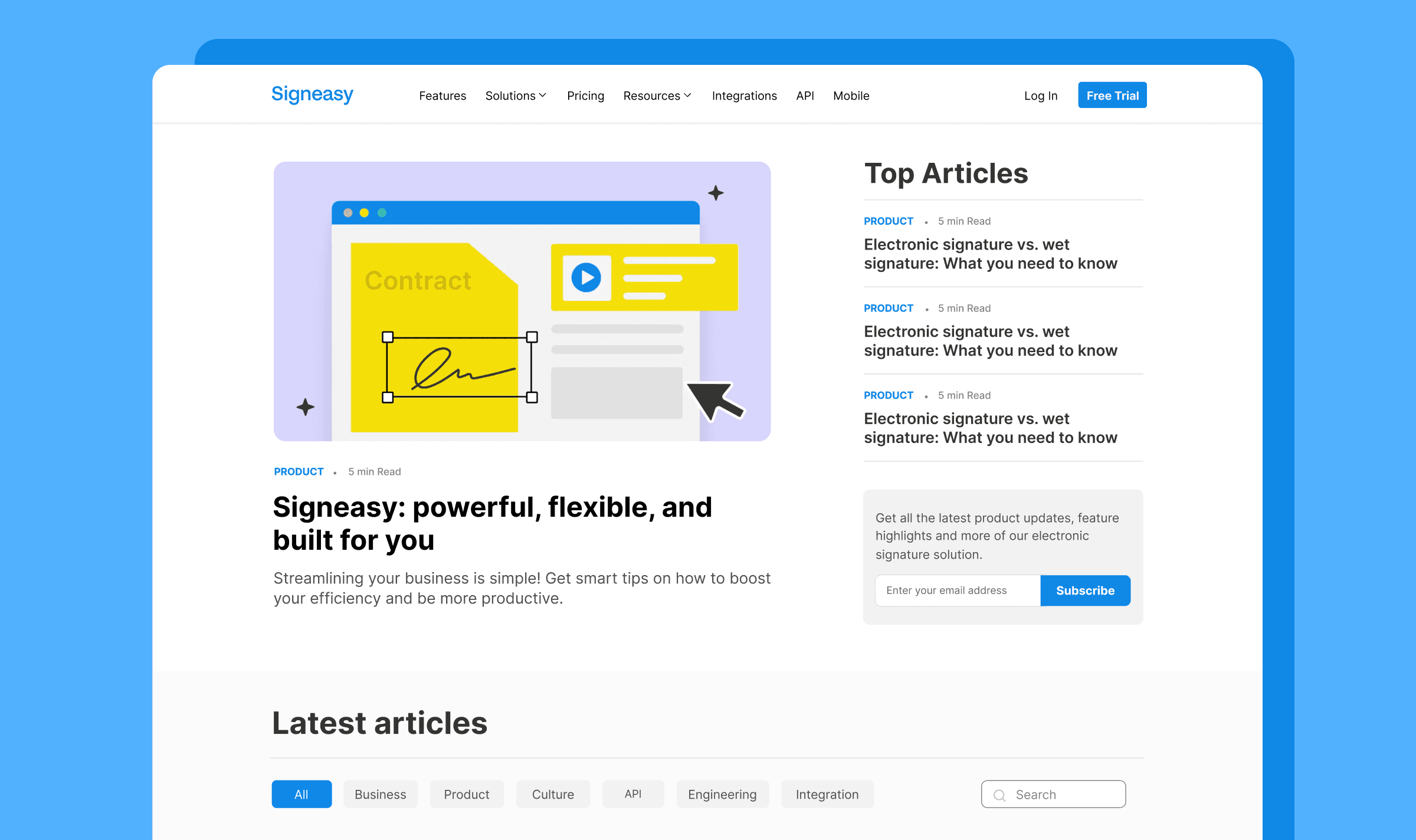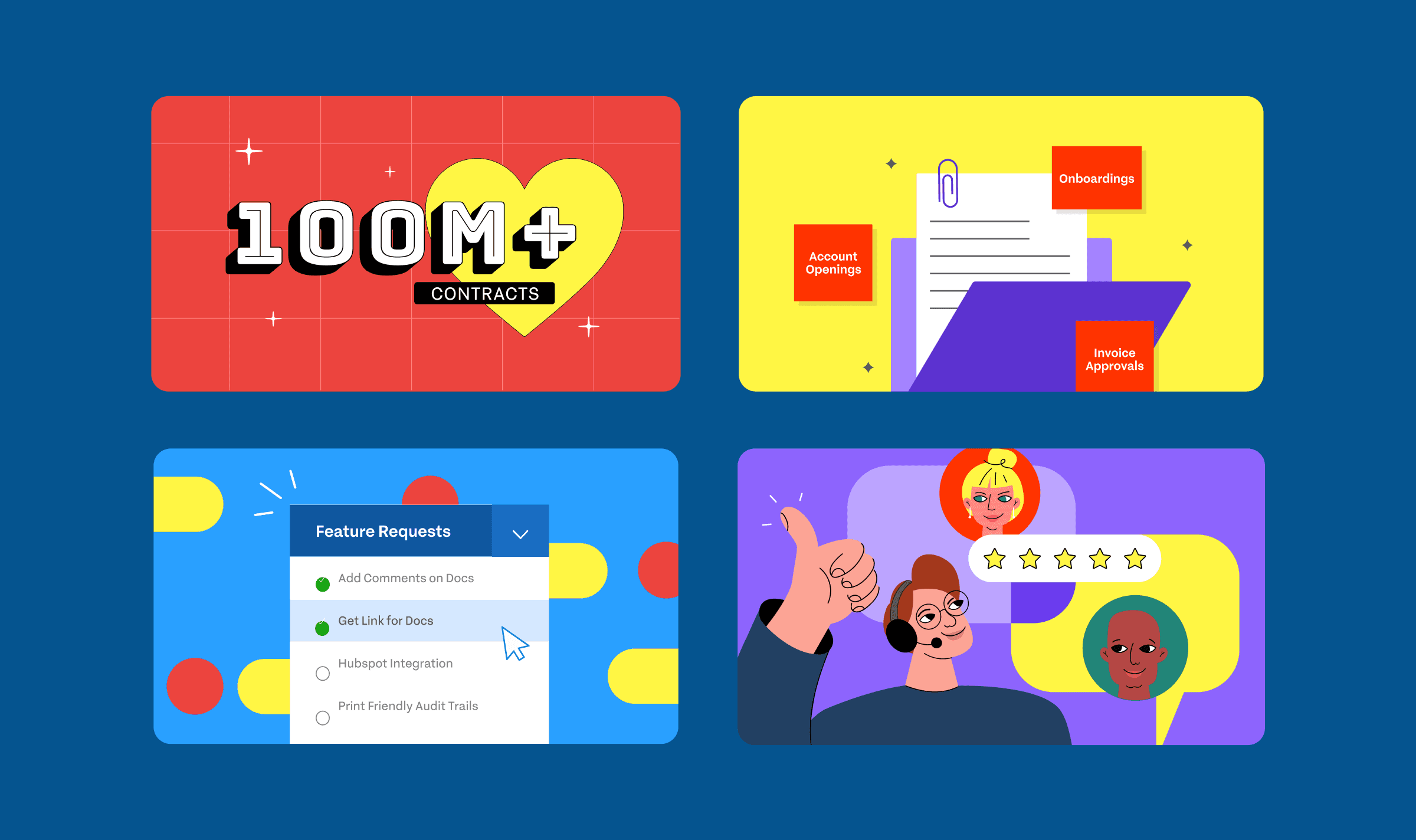 Use of the brand palette with Signeasy Blue as the primary color and Yellow accents for warmth and emphasis.
