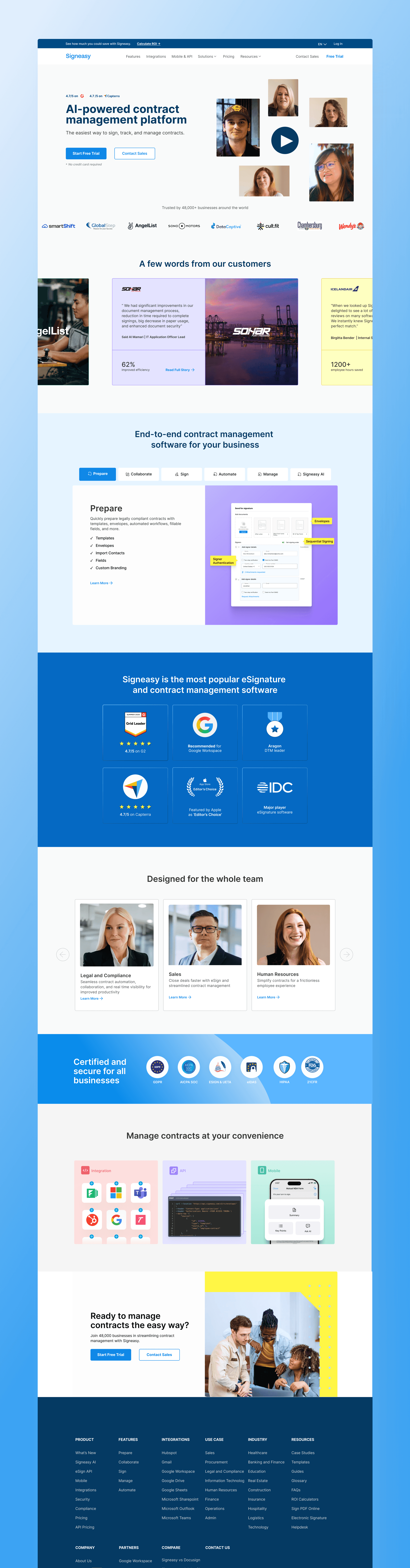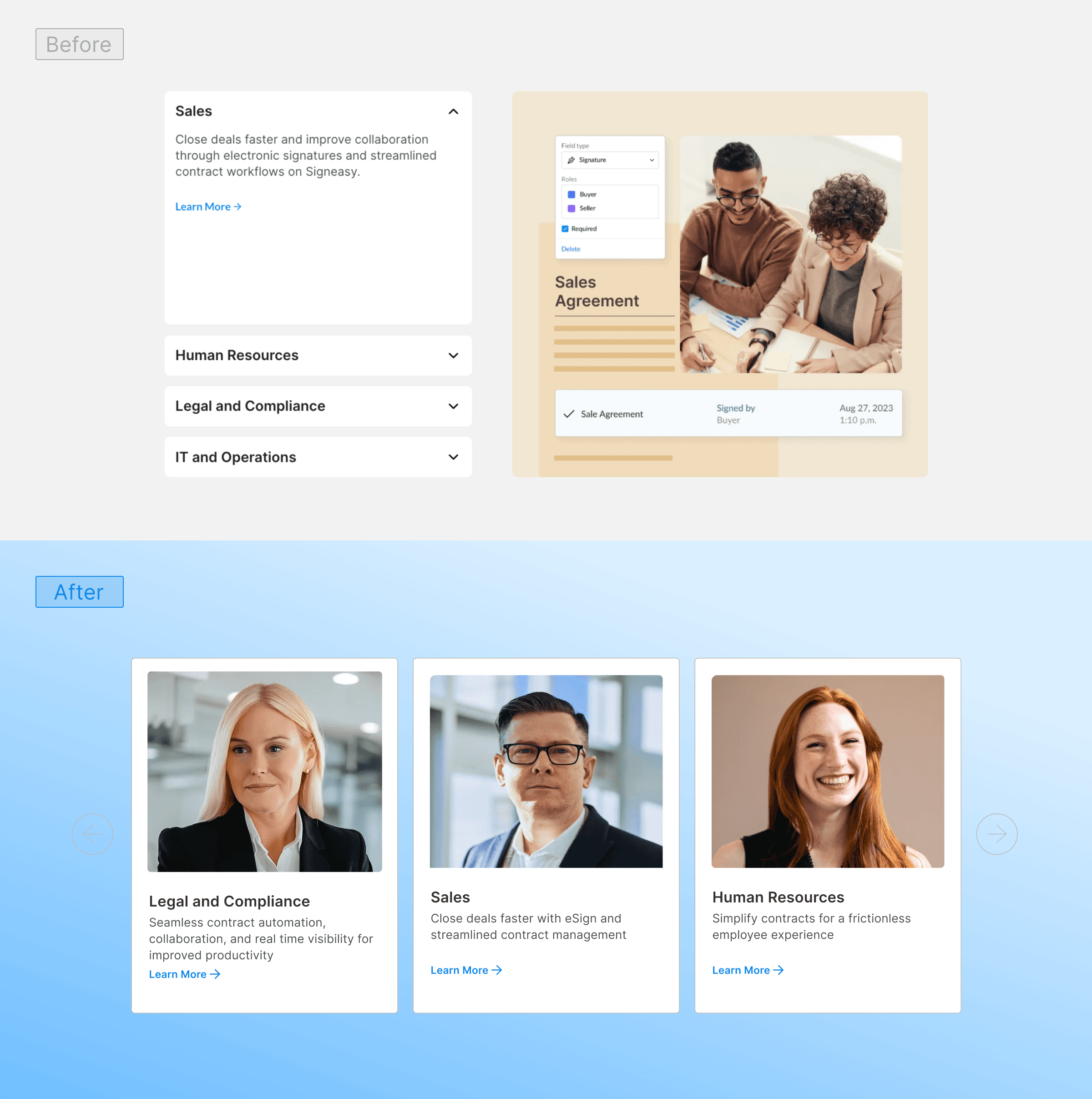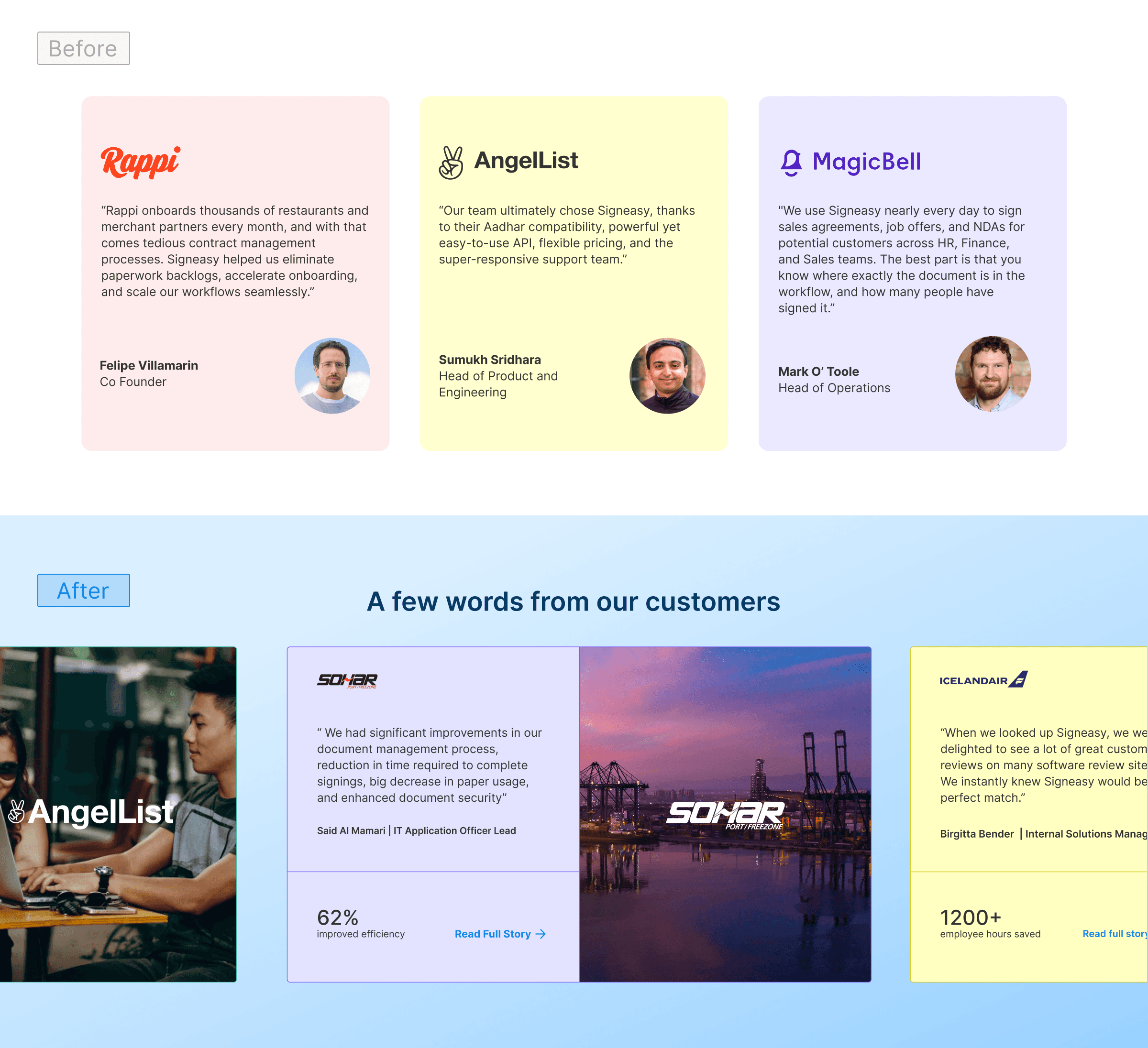 The customer story section was redesigned with a stronger visual focus to highlight the industries Signeasy serves and the real impact of the product. This made success stories more prominent, relatable, and engaging, encouraging greater user interaction.