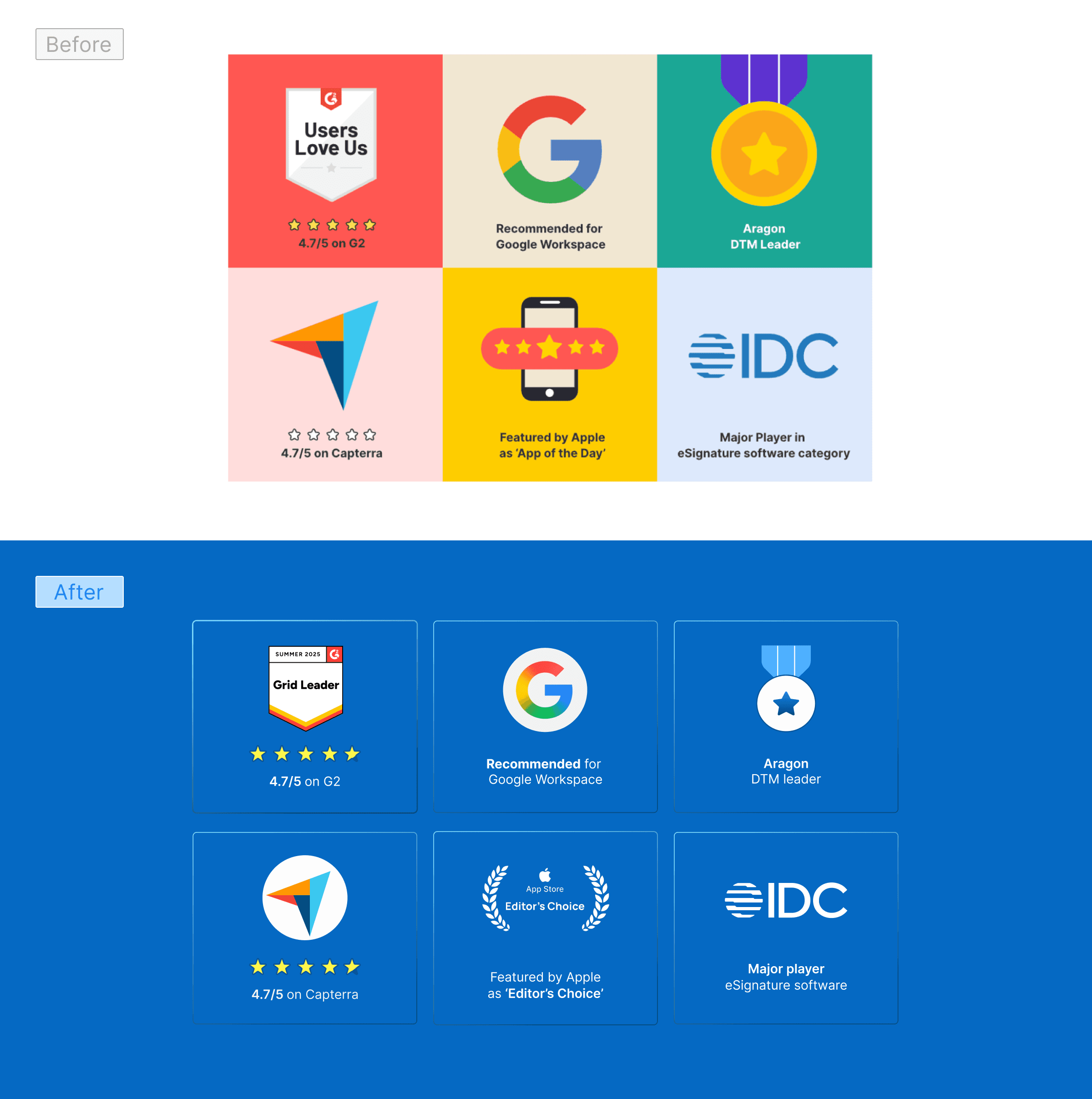 Refined the visual hierarchy to clearly highlight trust badges and ratings from platforms like G2 and Capterra, ensuring credibility stands out without overwhelming the rest of the content.