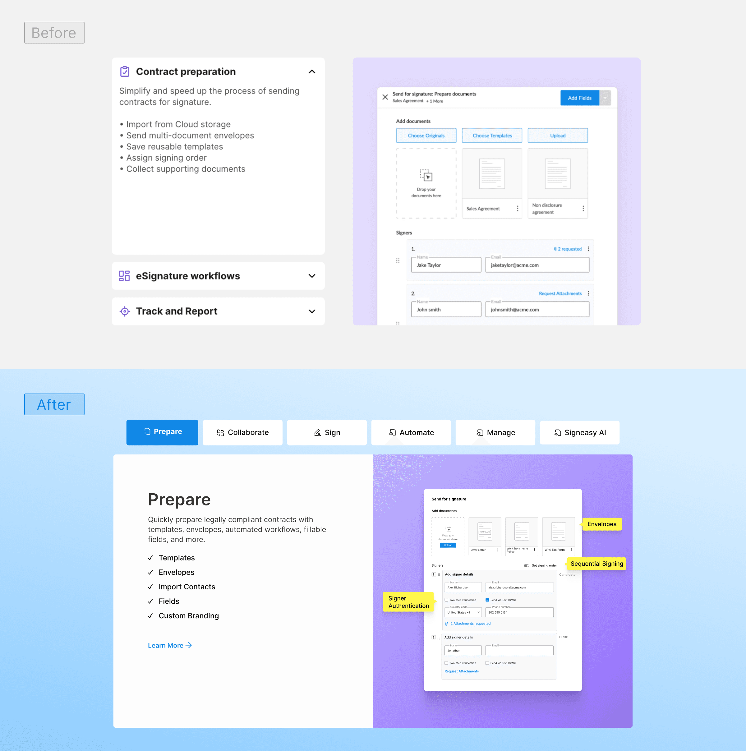 The goal of this project was to drive engagement through conversion-focused design. This included improving the UI/UX with cleaner navigation, adding trust signals like G2 badges, Capterra ratings, and customer stories in the first fold, and updating the messaging to reflect Signeasy’s current positioning. Key content was brought forward to reduce scroll depth and guide users more clearly toward conversion.